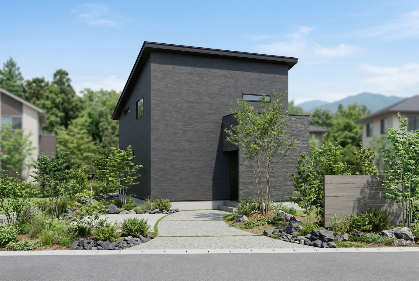 黒を基調にし、アクセントにダークグレーの石目調を組み合わせたスタイリッシュなファサード。