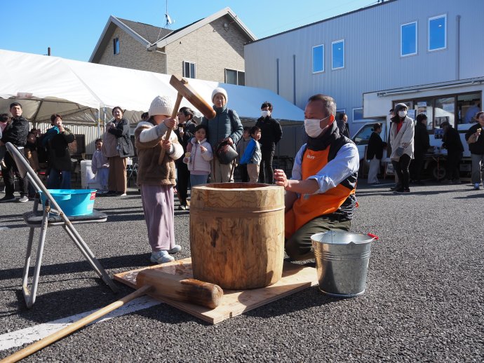 11時と14時から開催された【おもちつき】では、蒸したてのもち米をみんなでついて