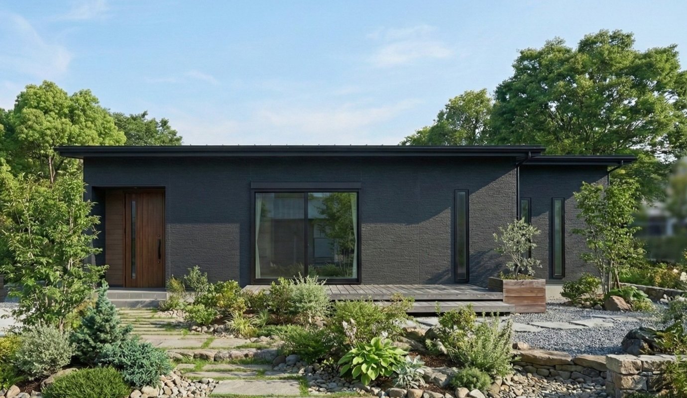 ガルバリウム鋼板の屋根がシャープで洗練された印象を与えます。
