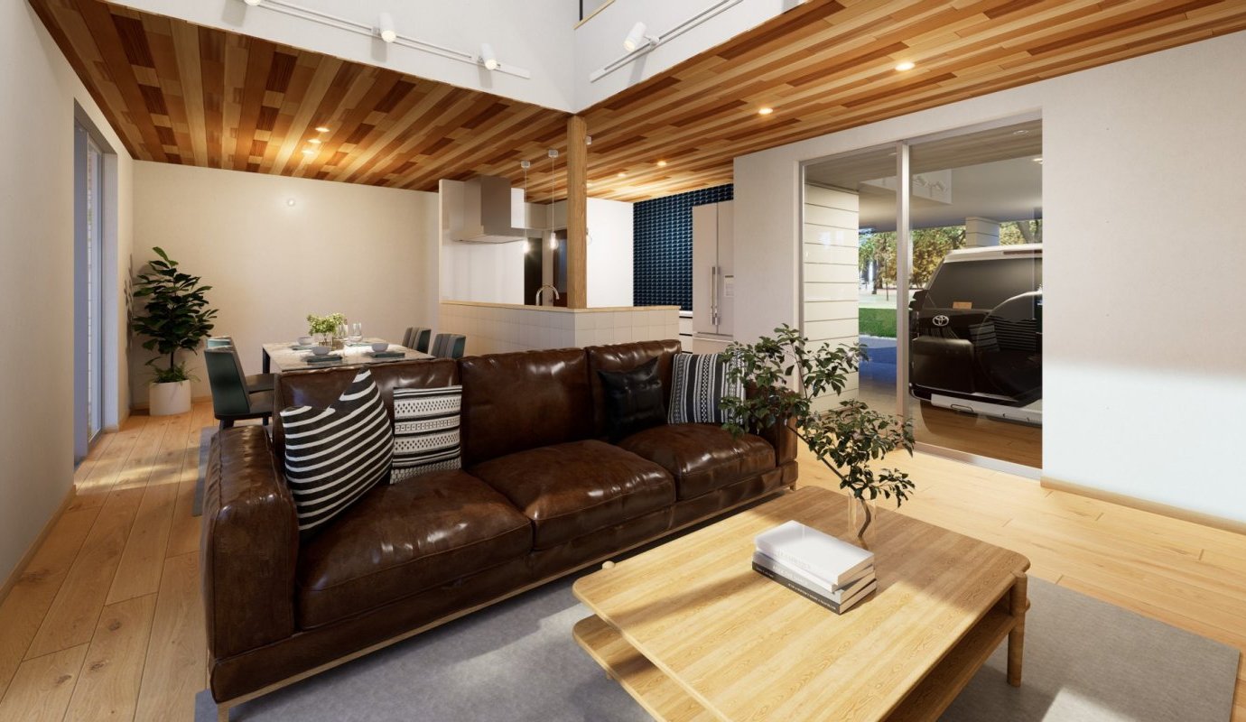 住居と直結しているインナーガレージは、雨の日でも濡れずに車にアクセス可能。買い物後の荷物の運搬もラクラクで、特に小さな子どもやシニアに優しい設計です。